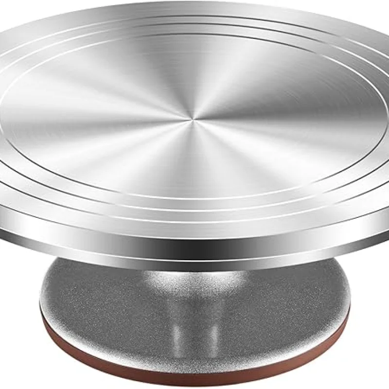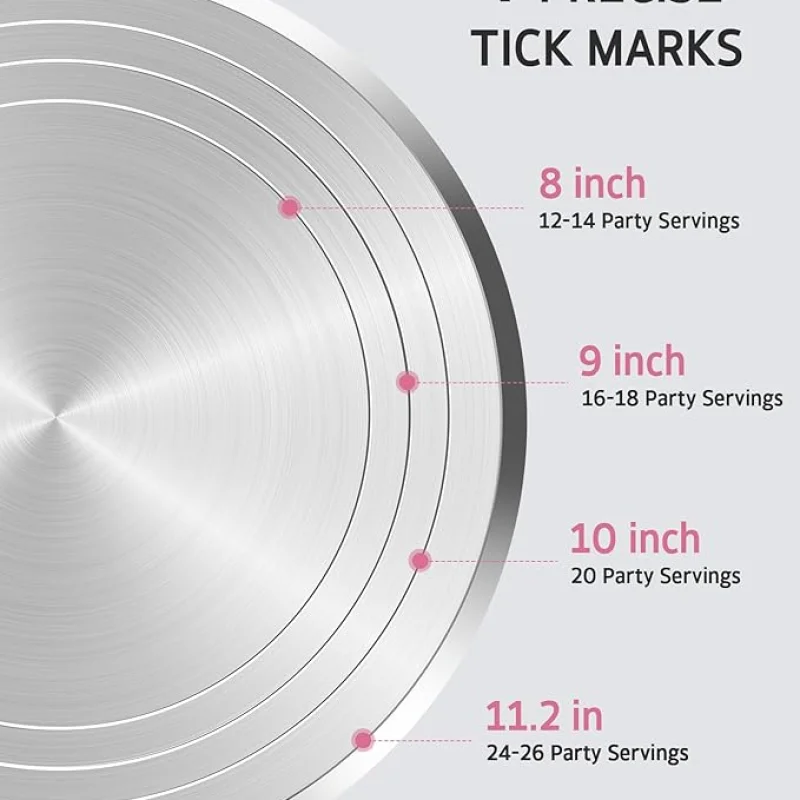 HEAVY DUTY NON-SLIP TURNTABLE: cake spinner is made of aluminum alloy with non-skid rubberized bottom which provides an excellent stability on countertops. It revolves smoothly with hidden ball bearings which help in precision cake crafting for birthdays, weddings and other events. Cake platter has also lines on it that serve as guides to position your cake Non-slip surface and rubber feet smoothly rotate your cakes in place while decorating, ensuring precision and accuracy on our 12 inch turntable. Elevate your cake decorating skills with our revolving cake stand, providing easy access to all sides of your cake for flawless frosting. Perfect for beginners looking to add some dramatic flair to their icing jobs The Aluminum Cake Turntable is great for baking classes, cake decorating workshops, or for any baking enthusiasts who want to learn new techniques and skills. With this Cake Turntable, you'll can create amazing cakes, and you'll be able to share your new skills with others. CUSTOMER SATISFACTION GUARANTEE: Your satisfaction is what drives us to provide the highest quality products. If at any time you are not completely satisfied with your purchase feel free to return it to us for a full and prompt refund